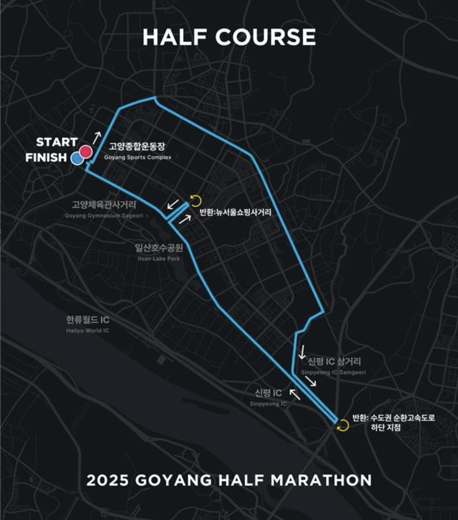 ✓ 10K | 종합운동장 사거리 - 법곳 IC(1차 반환점) - 고양체육관 사거리 - 호수로 - 뉴서울쇼핑사거리(2차 반환)- 호수로 - 고양체육관 사거리 - 종합운동장 사거리 - 종합운동장
